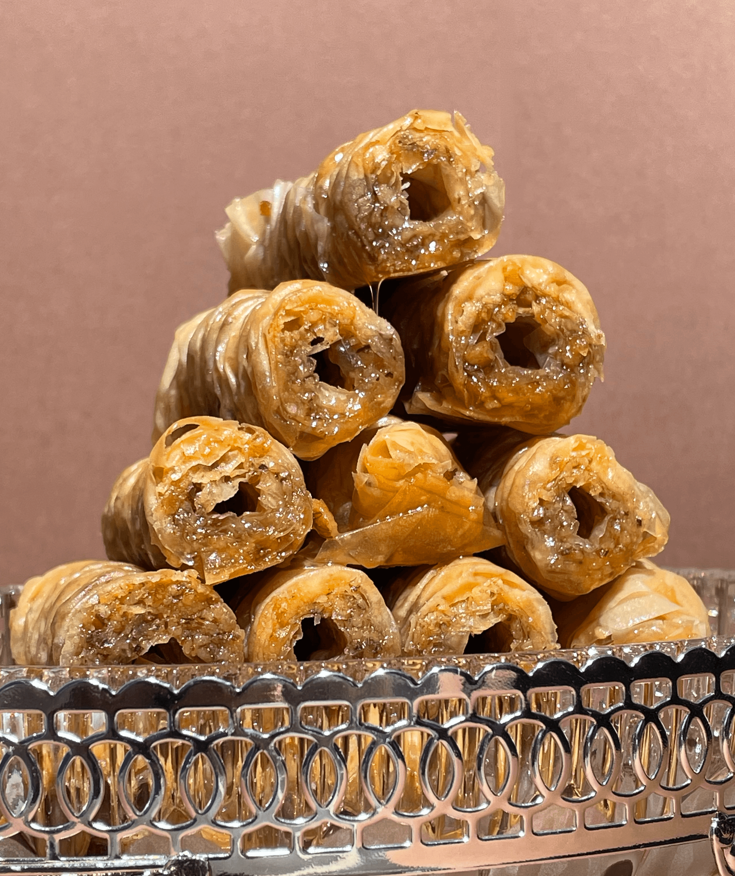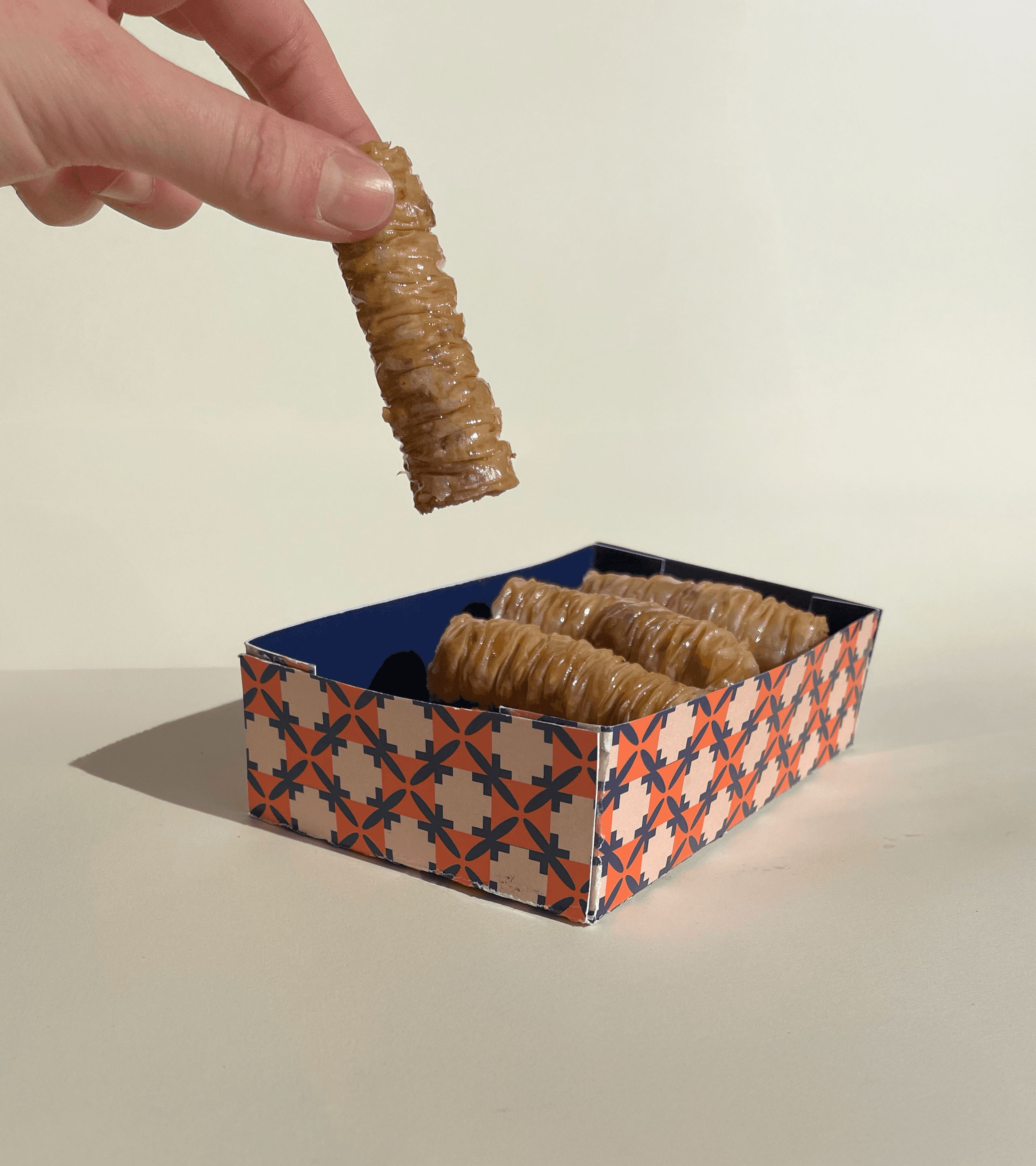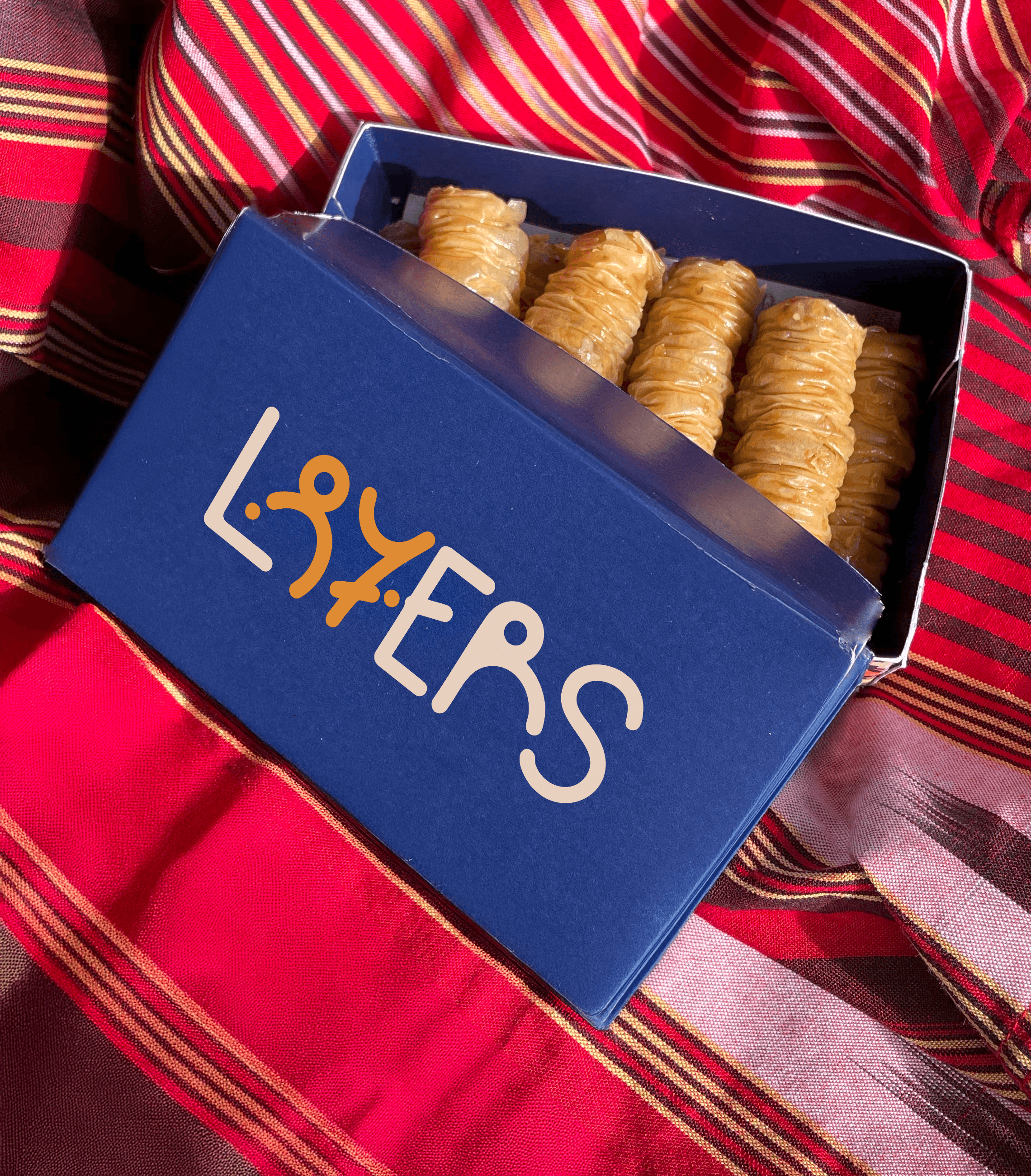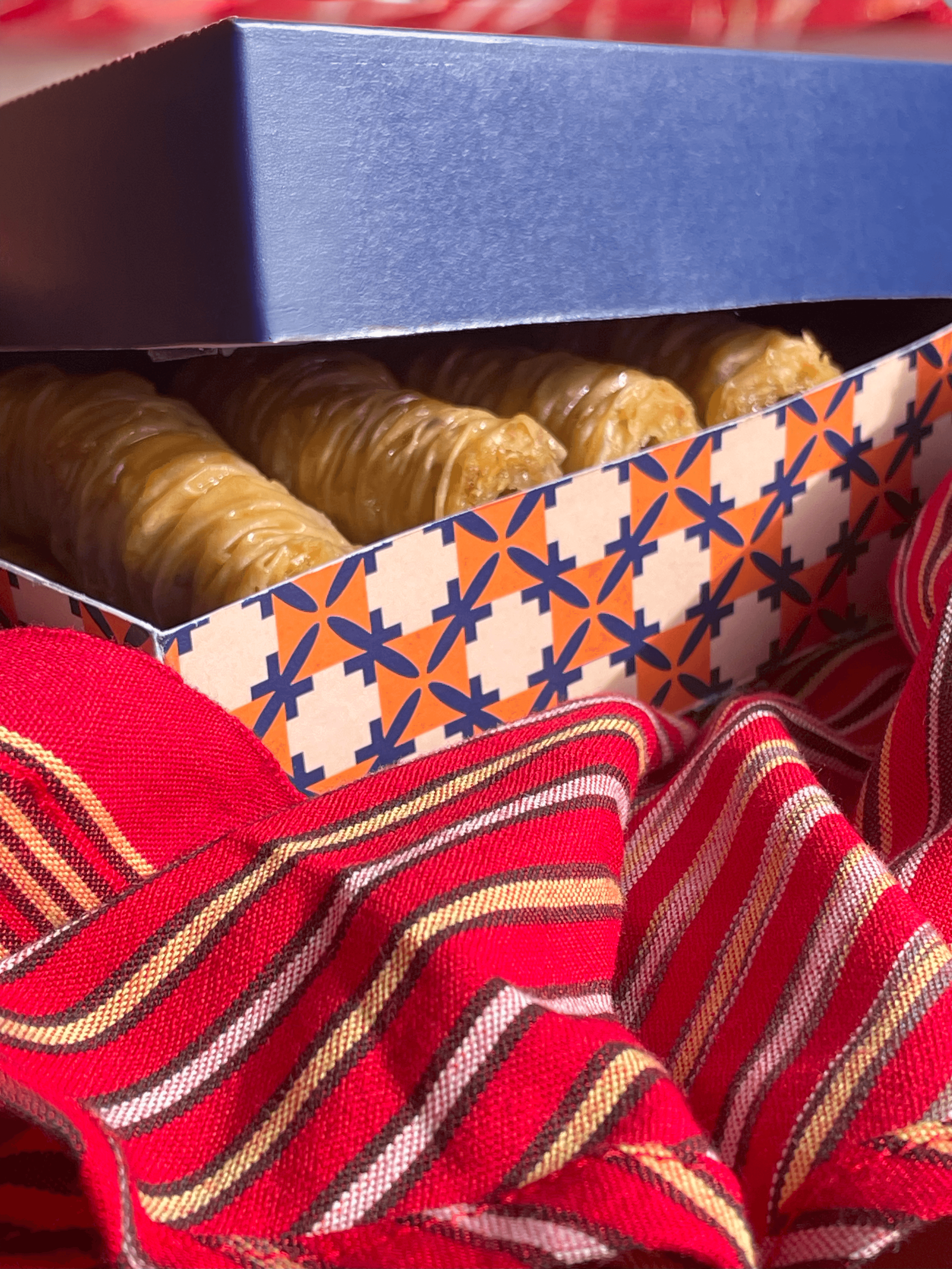 The colours in this brand identity offer a modern twist on a cultural tradition, reflecting values of trust, family, care, and craftsmanship in the making of baklava.