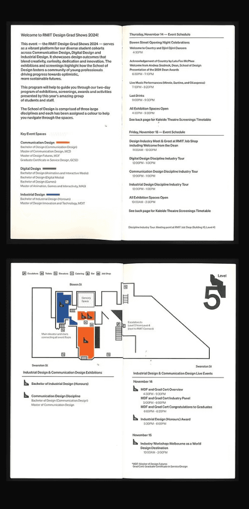 To celebrate the achievements of graduating students, RMIT’s School of Design organised a two-day exhibition showcasing work from all nine programs. I was chosen and responsible for developing the brand identity and wayfinding for the event.